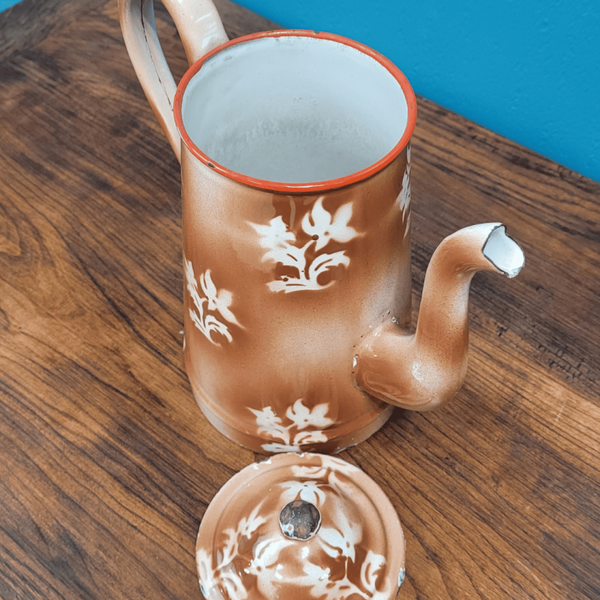 Cafetière en fer émaillé à motif floral sur un dégradé de maron.