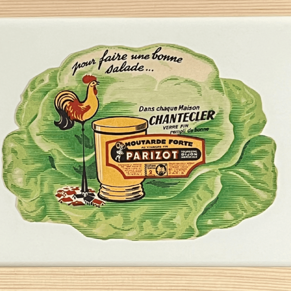 C'est ce que nous propose ce superbe buvard publicitaire en forme de salade faisant coup double avec les verres fins Chantecler et la Moutarde Parizot.