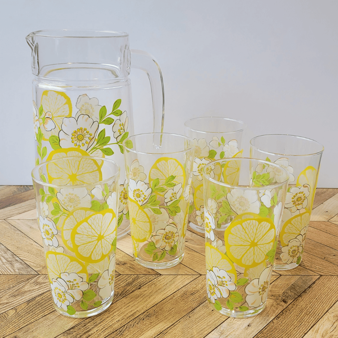 Service composé d'un pichet et de 5 verts à citronnade. L'ensemble est joliment décoré de tranches de citrons et de fleurs de citronnier.