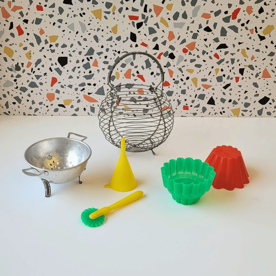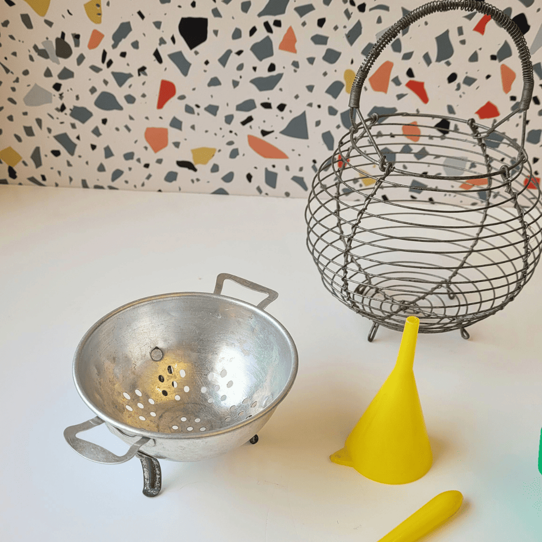 Dinette vintage avec panier et passoire métalique.