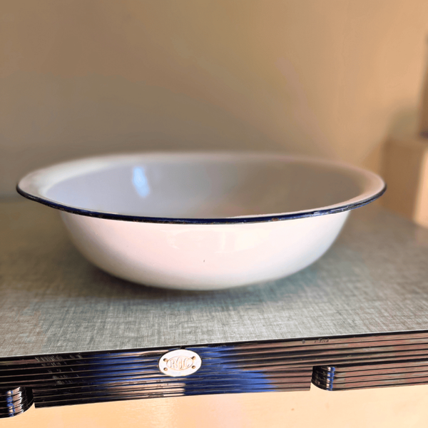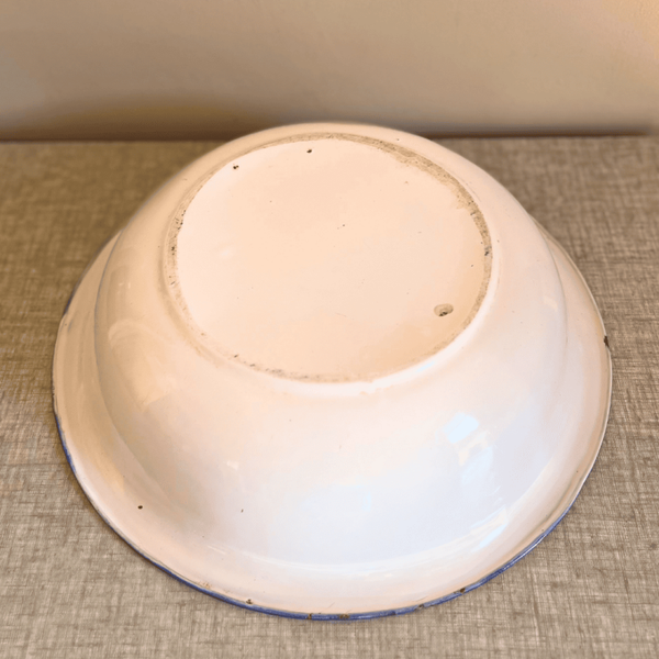 Grande bassine en fer émaillé de couleur blanche cerclée de bleu.