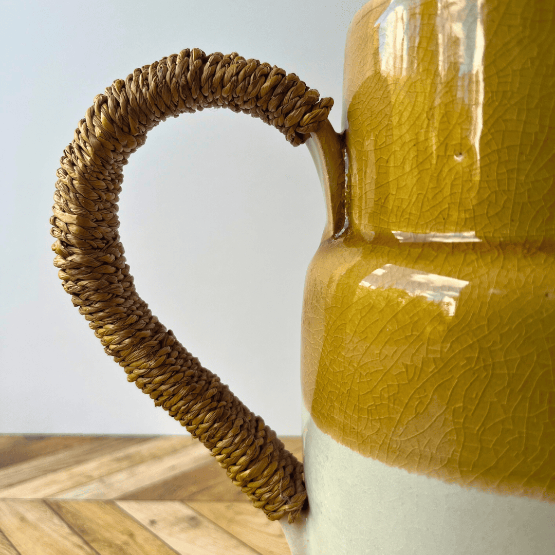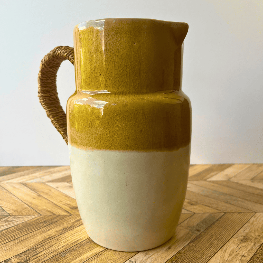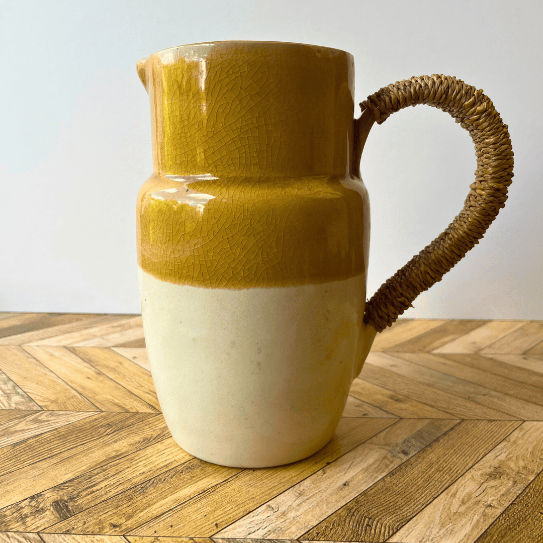 Un objet avec beaucoup de charme que ce pichet bicolore avec sa poignée sertie en osier.
