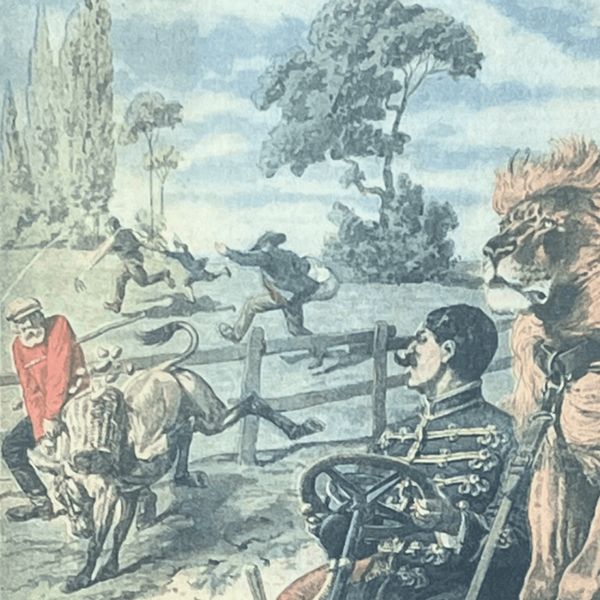 Illustration ancienne comique d'un lion roulant à pleine vitesse dans une voiture anciènne.