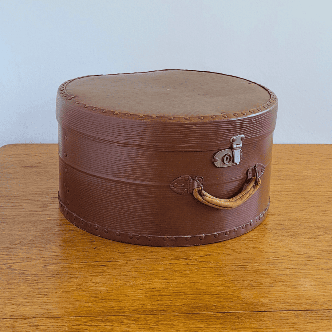 Boîte à chapeau grand format de couleur brune. Elle est doublée à l’intérieur d’un papier imprimé digne des plus grandes maisons de couture.